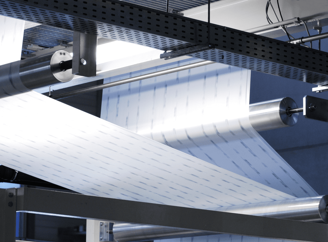 Der zusammengelegte Folienschlauch wird je nach Kundenwunsch beidseitig bedruckt und anschließend auf die Arbeitsbreite der Airpad™-Maschine geschnitten. Abschließend wird die Folie vollautomatisch auf Hülsen gewickelt und palettiert.
